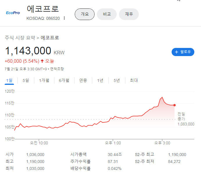 21일 외국인 코스닥에서 에코프로 5.54%와 에코프로비엠 5.24% 순매수 하였습니다.